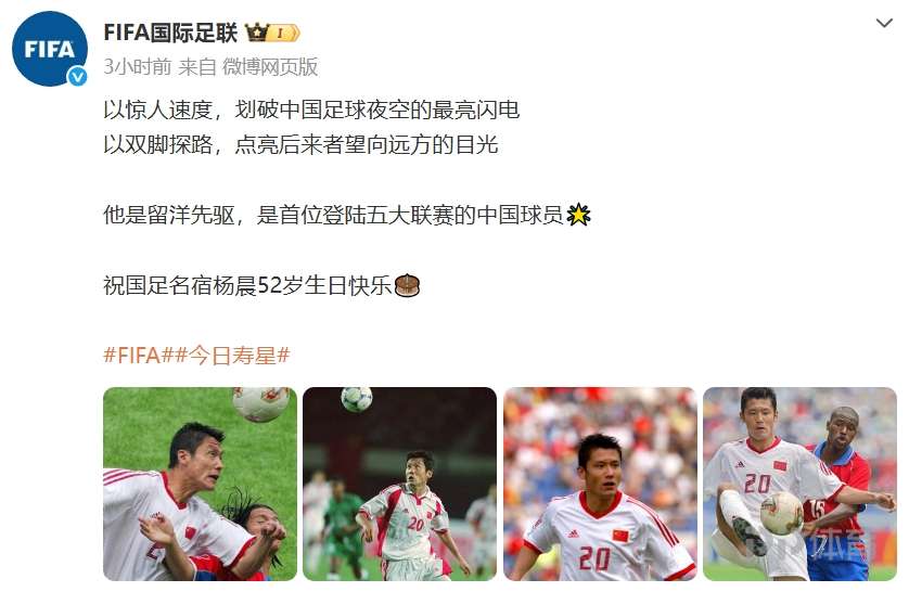今天是国足名宿杨晨的52岁生日,FIFA国际足联官博发文为其庆祝生日: