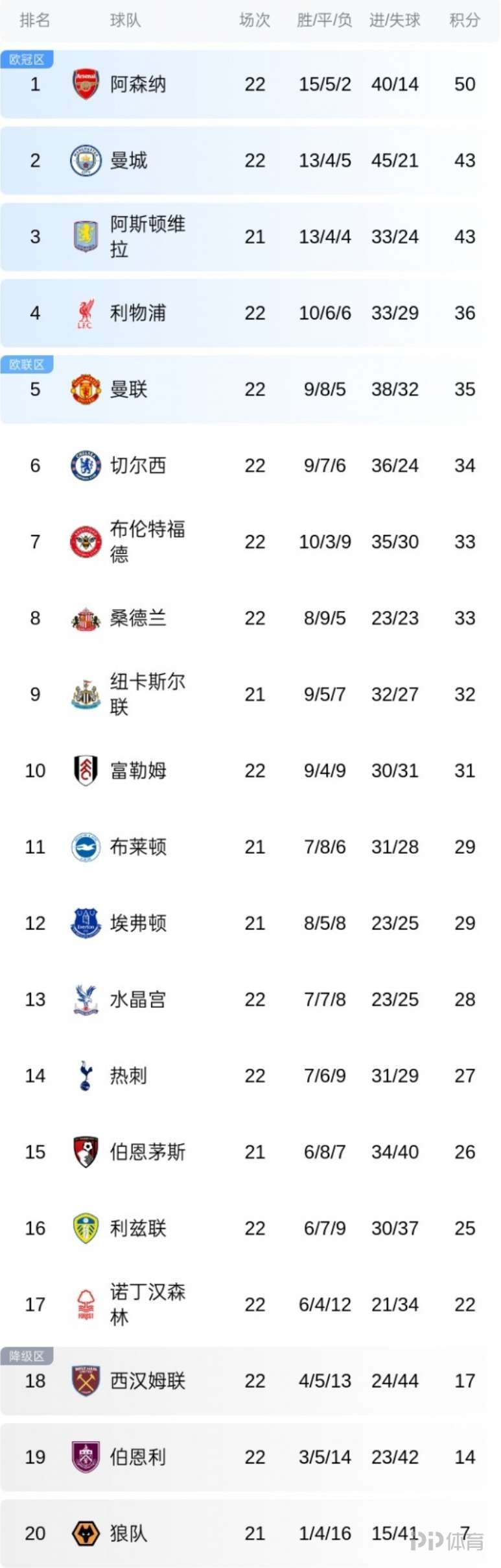 英超第22轮的7场比赛已经结束,积分榜的形势出现新的变化。