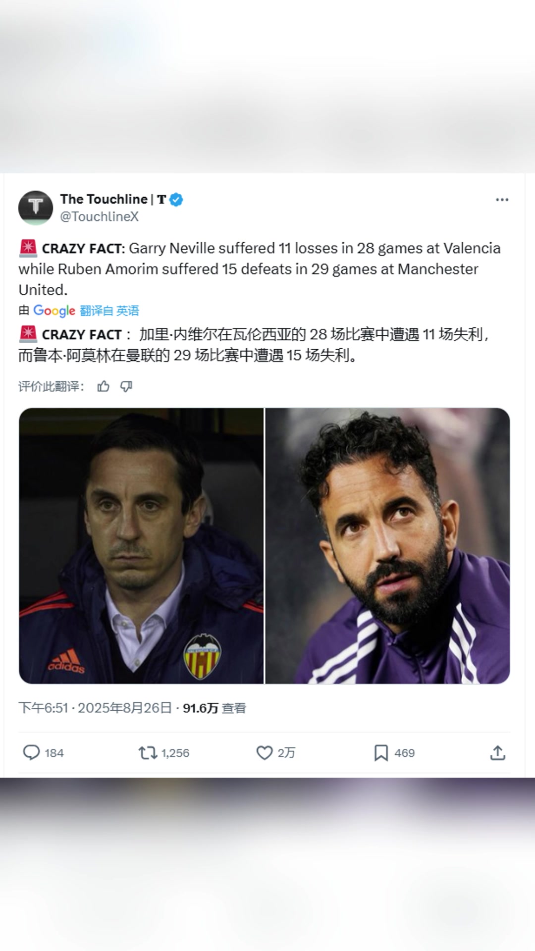 内维尔带队28场失利11场阿莫林在曼联29场失利15场