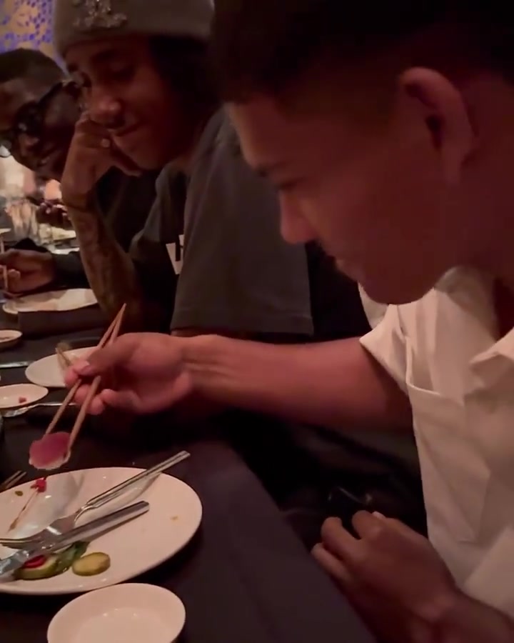曼联球员团建聚餐迭戈-莱昂第一次尝试用筷子吃东西