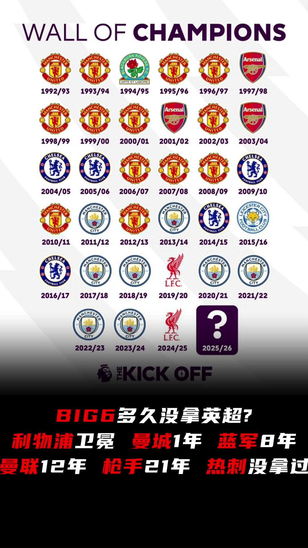 英超Big6多久没拿冠军曼联12年枪手21年热刺没拿过