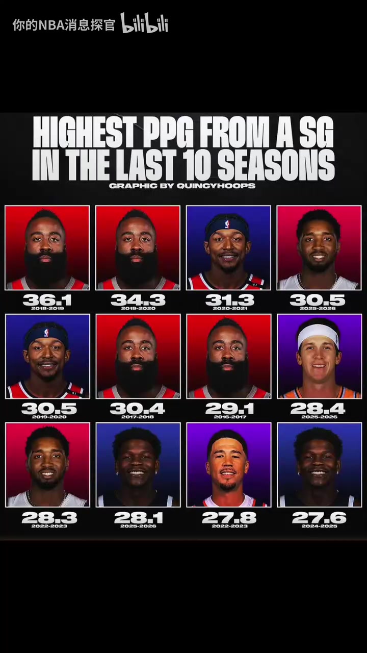 哈登独占四席过去十年得分后卫场均得分排行榜后浪推前浪